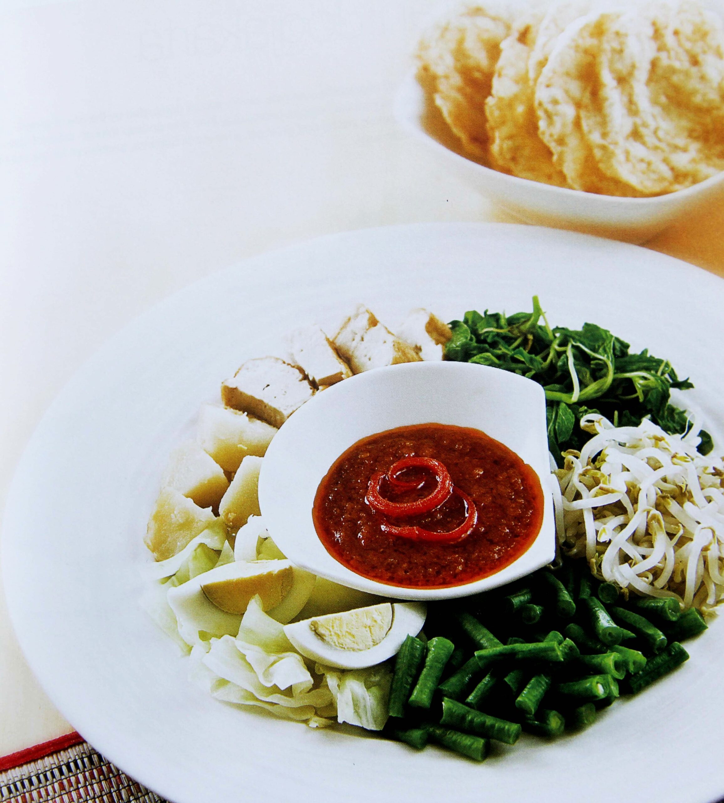 Sebagai bumbu siramannya, berupa saus kacang berwarna kecoklatan yang lumayan kental bertekstur halus dan lembut. Tambahan kerupuk, emping, dan bawang goreng di bagian atasnya kian menambah kenikmatan pada sajian ini.