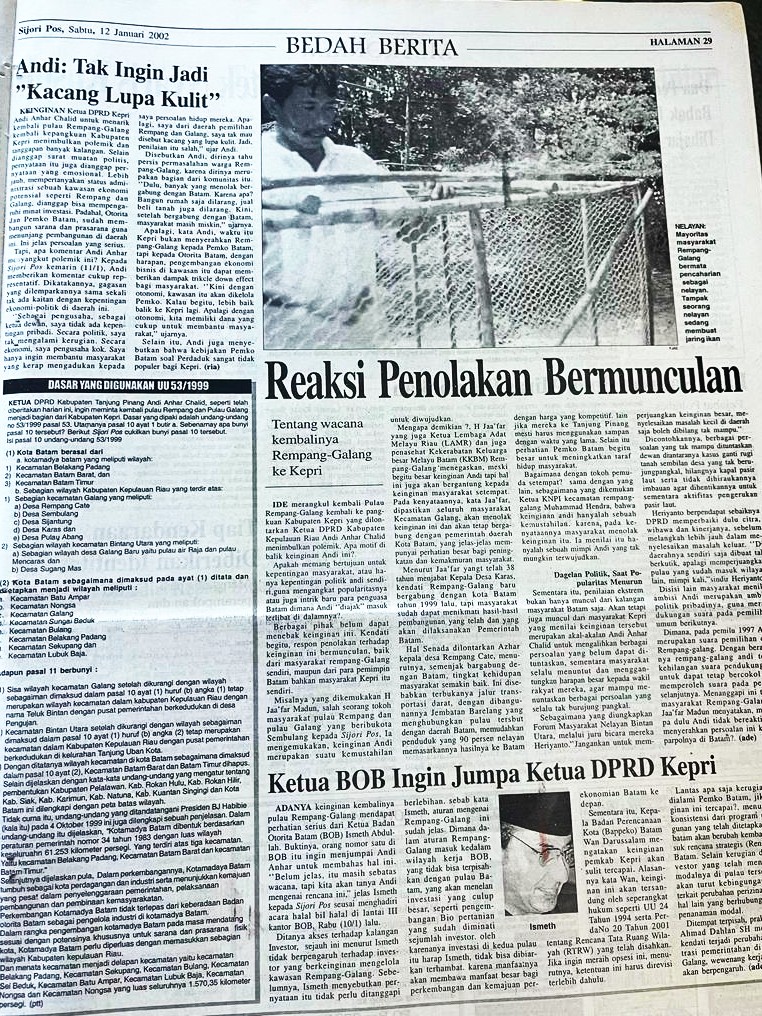 Pernyataan Ketua DPRD Kabupaten Kepulauan Riau saat itu, Andi Anhar Chalid yang meminta Rempang Galang dikembalikan ke Kabupaten Kepri, cukup mengejutkan dan menimbulkan polemik. ’’Banyak yang menolak bergabung ke Batam. Bangun rumah dilarang. Jual beli tanah dilarang. Bergabung dengan Batam, masyarakat masih miskin,’’ kata Andi Anhar Chalid, saat itu. (Sijori Pos, 12 Januari 2002). Entah karena sikap politik Ketua DPRD Kabupaten Kepulauan Riau itu, Otorita Batam dan Pemko Batam seolah berlomba mencari investor masuk ke Rempang Galang.