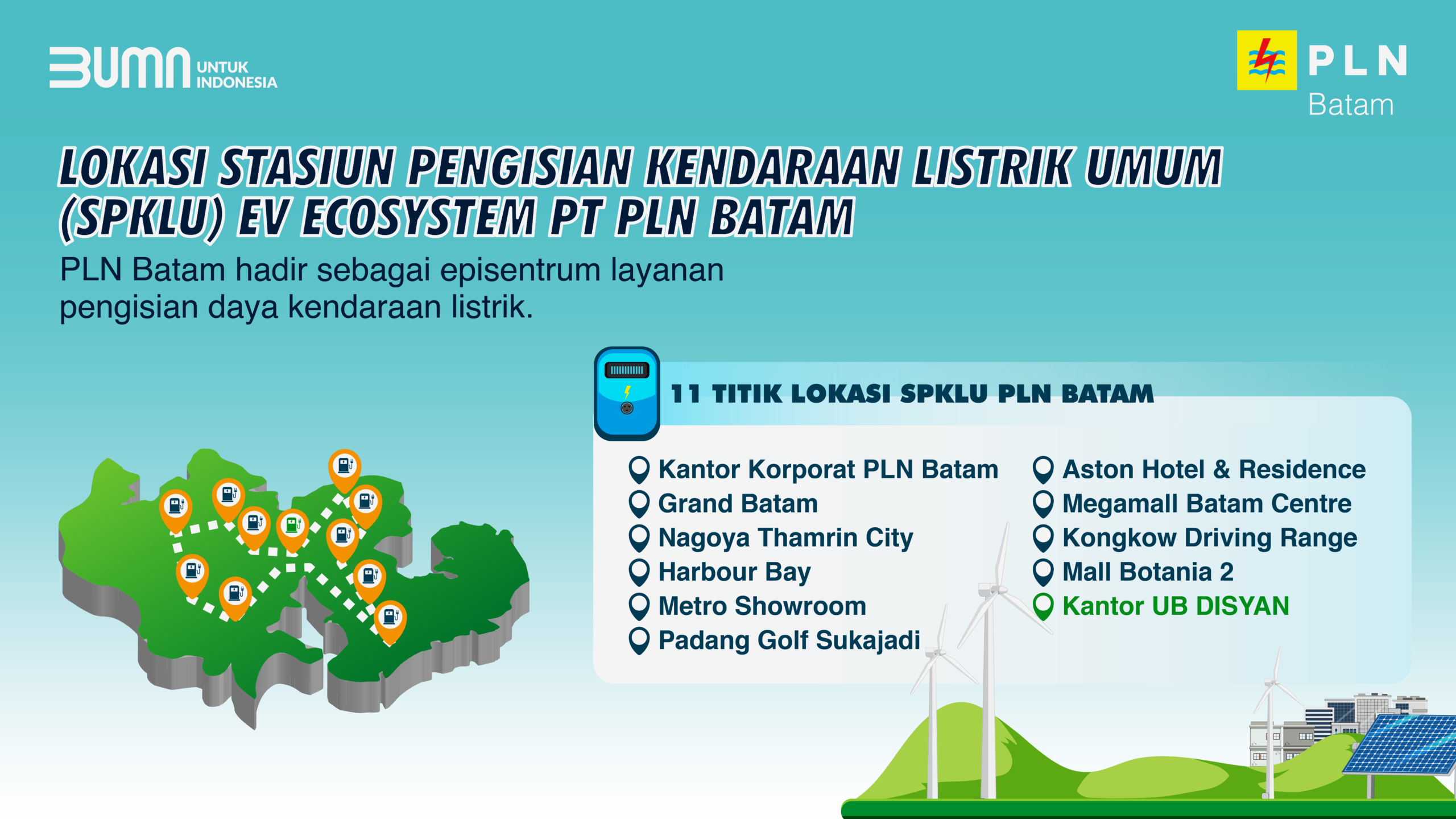 Beberapa titik SPKLU yang telah tersedia antara lain di Grand Batam, Harbourbay, Mega Mall, Nagoya Thamrin, Padang Golf Sukajadi, hingga Metro Showroom. Selain itu, fasili-tas serupa juga dapat ditemukan di Mall Botania, Kantor PLN Korporat, Kantor PLN Disyan 1 dan 2, Hotel Harris Batam Centre, kawasan Petra Tiban, Kantor Pajak Sukajadi, Taman Golf Residence, showroom kendaraan listrik BYD, Kantor PP Polri, Polresta Barelang, hingga Masjid Bintang Amin Angkasa.